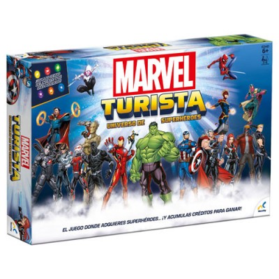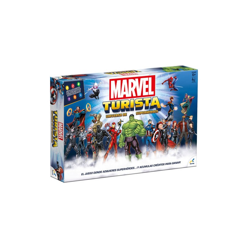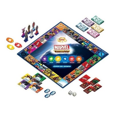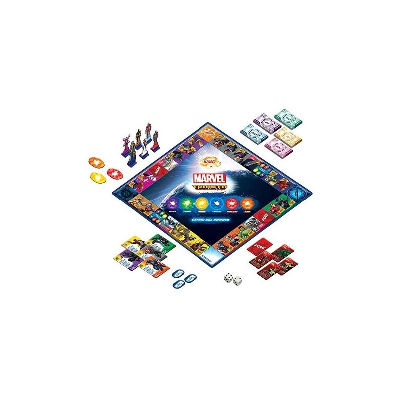 Contiene y tablero de cartón con 24 casillas de súper héroes que puedes comprar, 2 casillas POW donde se pelearan las batallas más épicas con 24 tarjetas Pow para que el reto sea variado y divertido También contiene 20 tarjetas con poder recargado y las 6 fabulosas gemas del infinito que podrás utilizar para obtener los poderes del universo 2 Dados, Billetes De Juguete Y 6 Increíbles Peones Que Se Moverán Durante El Juego Entre Las Casilla Elige Tu Favorito